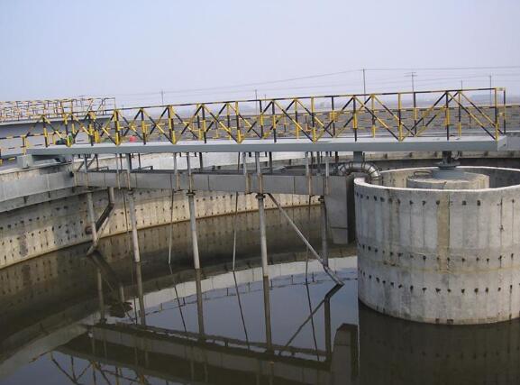 工作桥由安装周边的驱动机构带动,绕安装在池中心支墩上的中心支座旋转,安装在工作桥上的刮泥板在旋转过程中,将沉降在池底的污泥刮向中心的集泥坑。同时,液面上的浮渣在浮渣刮板和周边挡渣堰形成的渐缩区域内集中,由浮渣耙扒到集渣斗,排出池外。